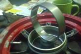 Продолжаю...Нагрел диск на электропечке(зону торм.барабана,а не весь диск) примерно до 120гр.,и с помощью специально изготовленной наставки посадил вставку на место.Затем по новой выточил с одной установки новую оправку(чтоб исключить биение при использовании старой оправки),на которую снова закрепил диск,и расточил чистовой размер.Так же удалил с помощью наждачки краску на бортах диска,и шлифонул немного(дома полирну слегка),потому как краска кое где облущилась при монтировке,так будет лучше-не так заметно при очередной смене резины теперь в этих местах краска понятно что не будет облетать...