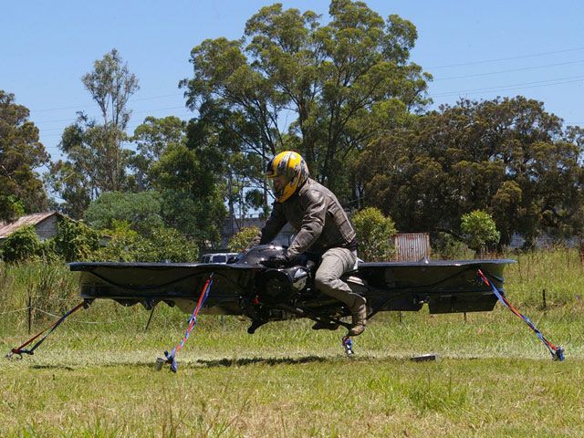 Летающий мотоцикл изобрел австралийский энтузиаст, который утверждает, что его детище под названием Hoverbike может взлетать на высоту до 3000 метров, развивая скорость примерно до 200 км/ч. На одной заправке диковинка может продержаться в воздухе около 45 минут, ее масса - 270 кг.